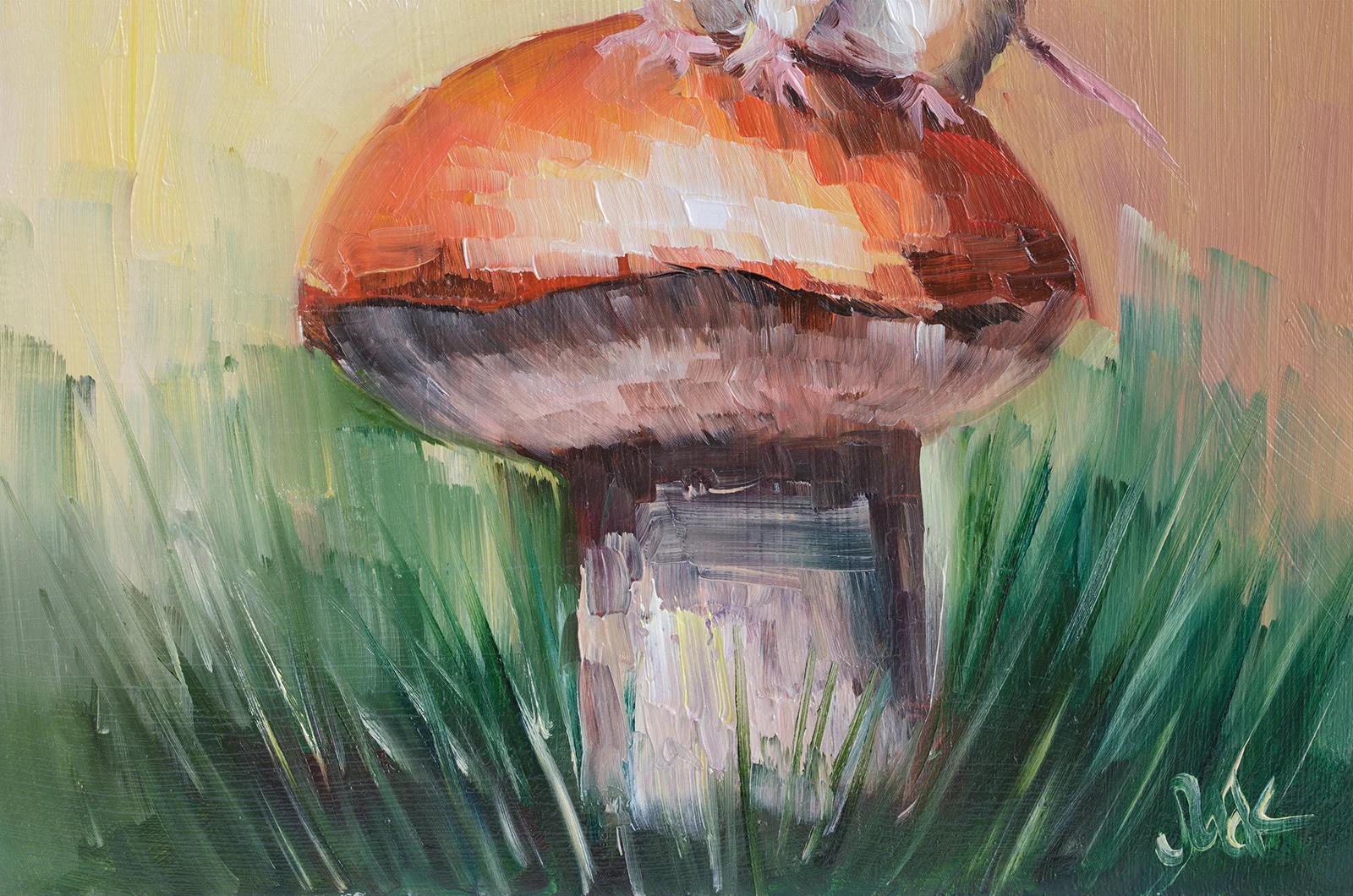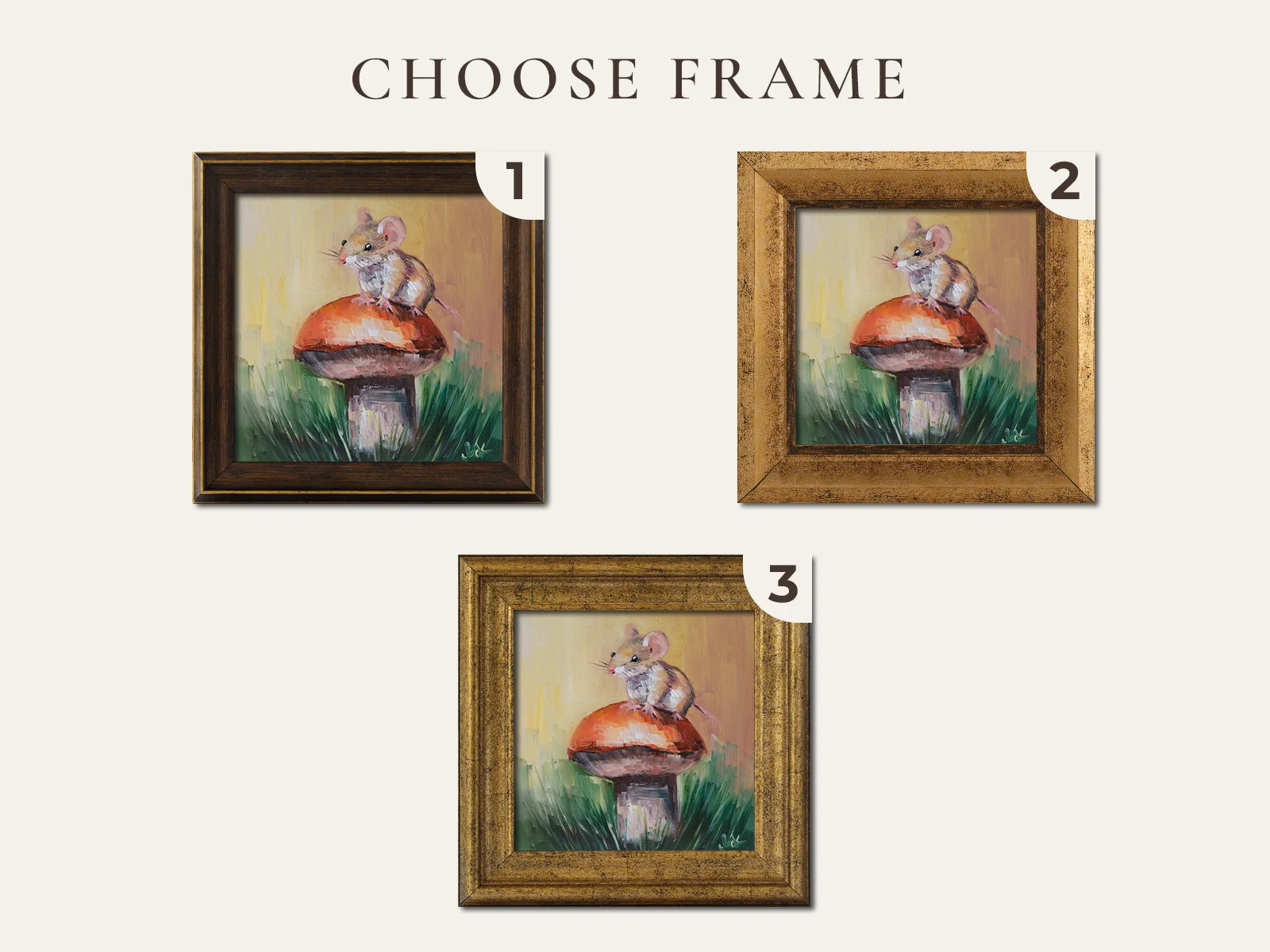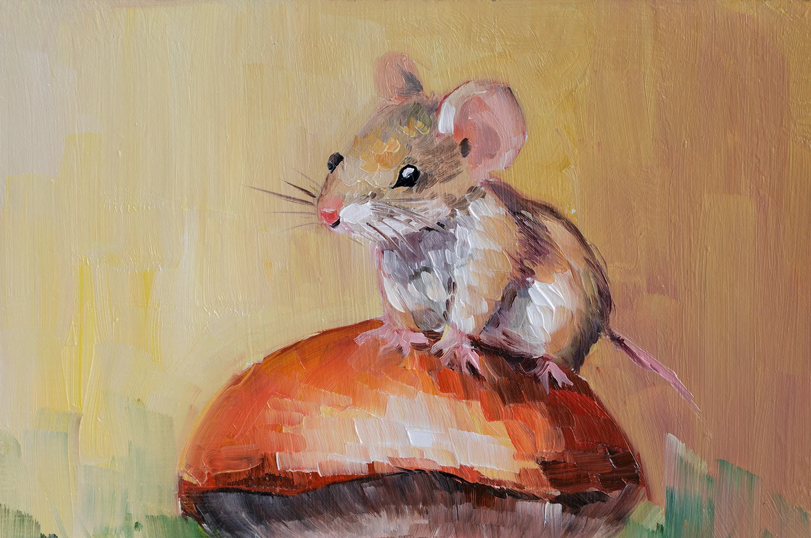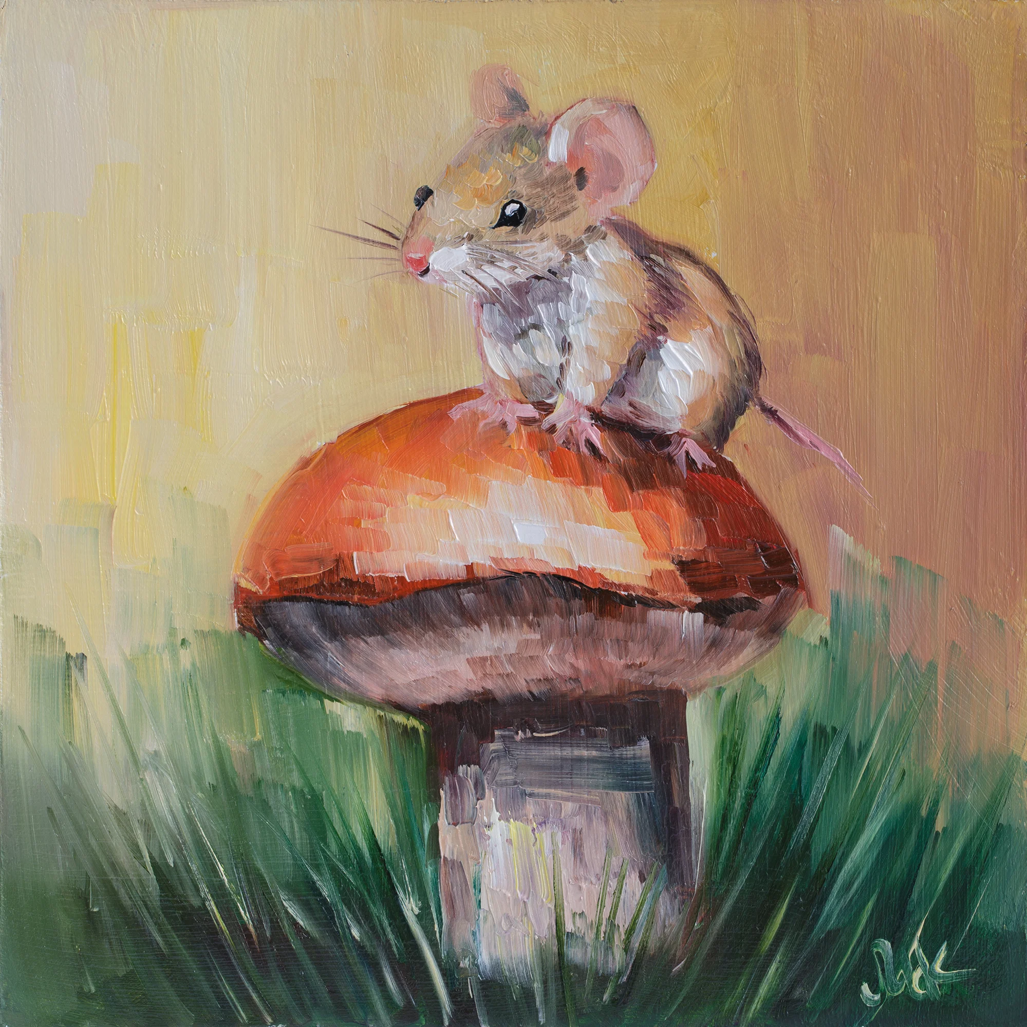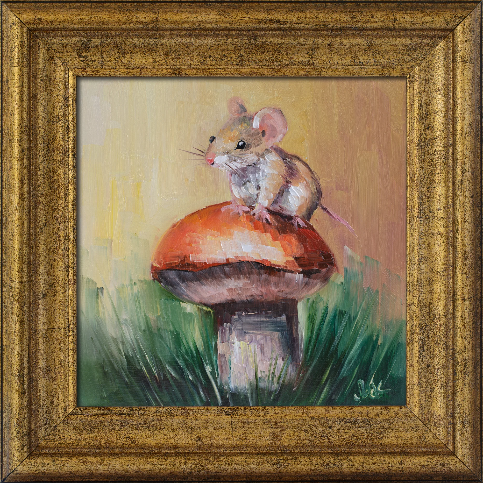 Mouse on Mushroom Oil Painting FramedMouse on Mushroom Oil Painting: Forest Animal Art, 8×8” Framed