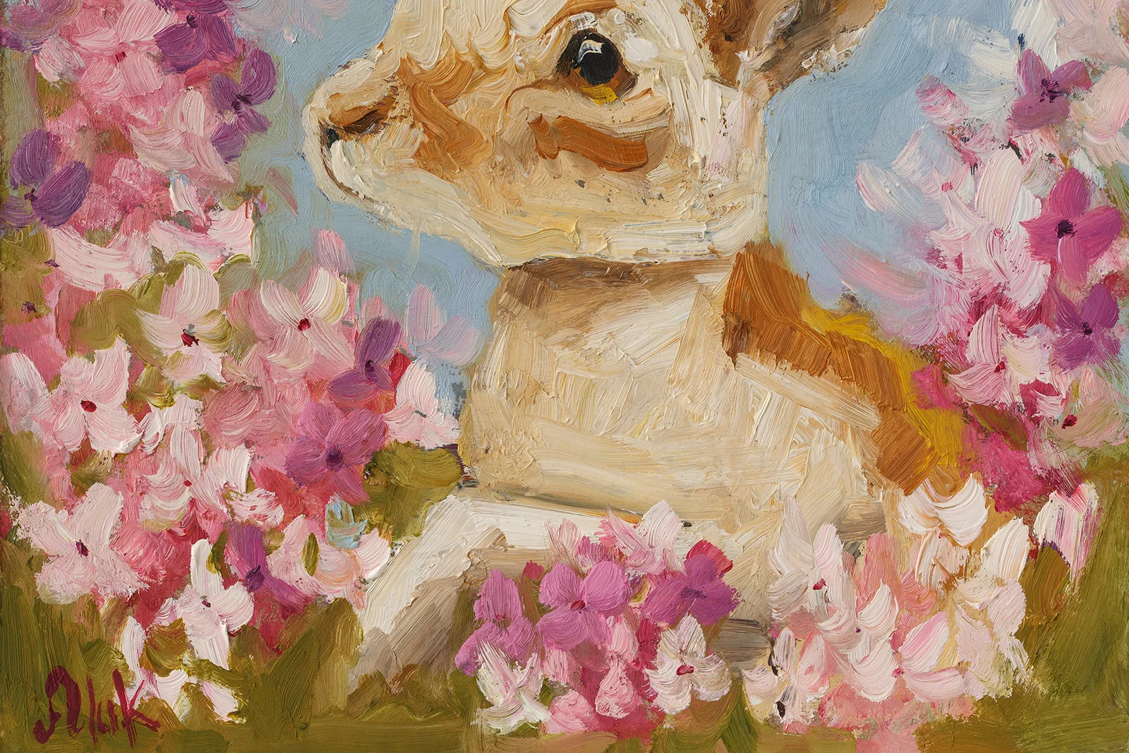 White Rabbit Oil Painting: Easter Bunny with Flowers, Original Framed Art