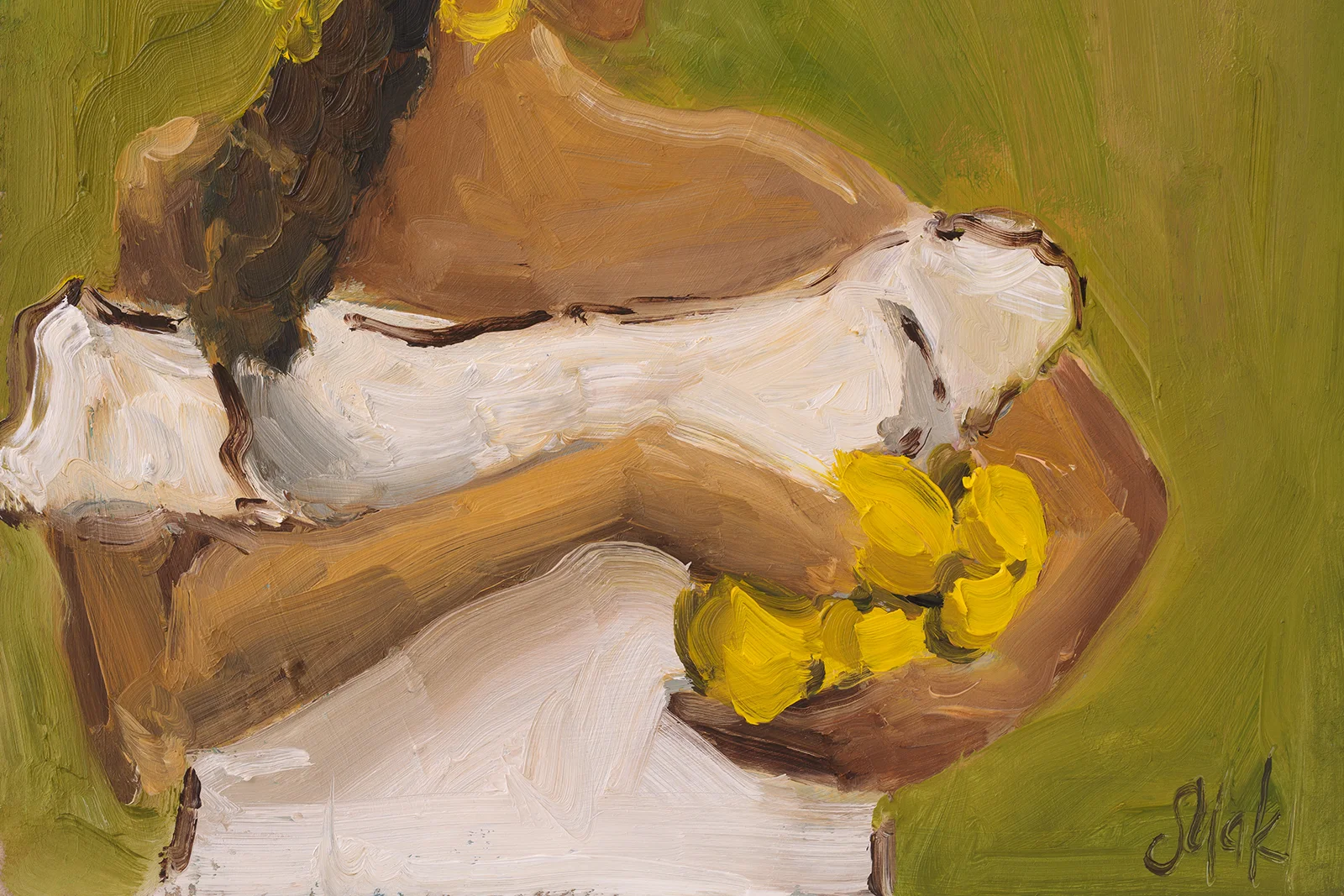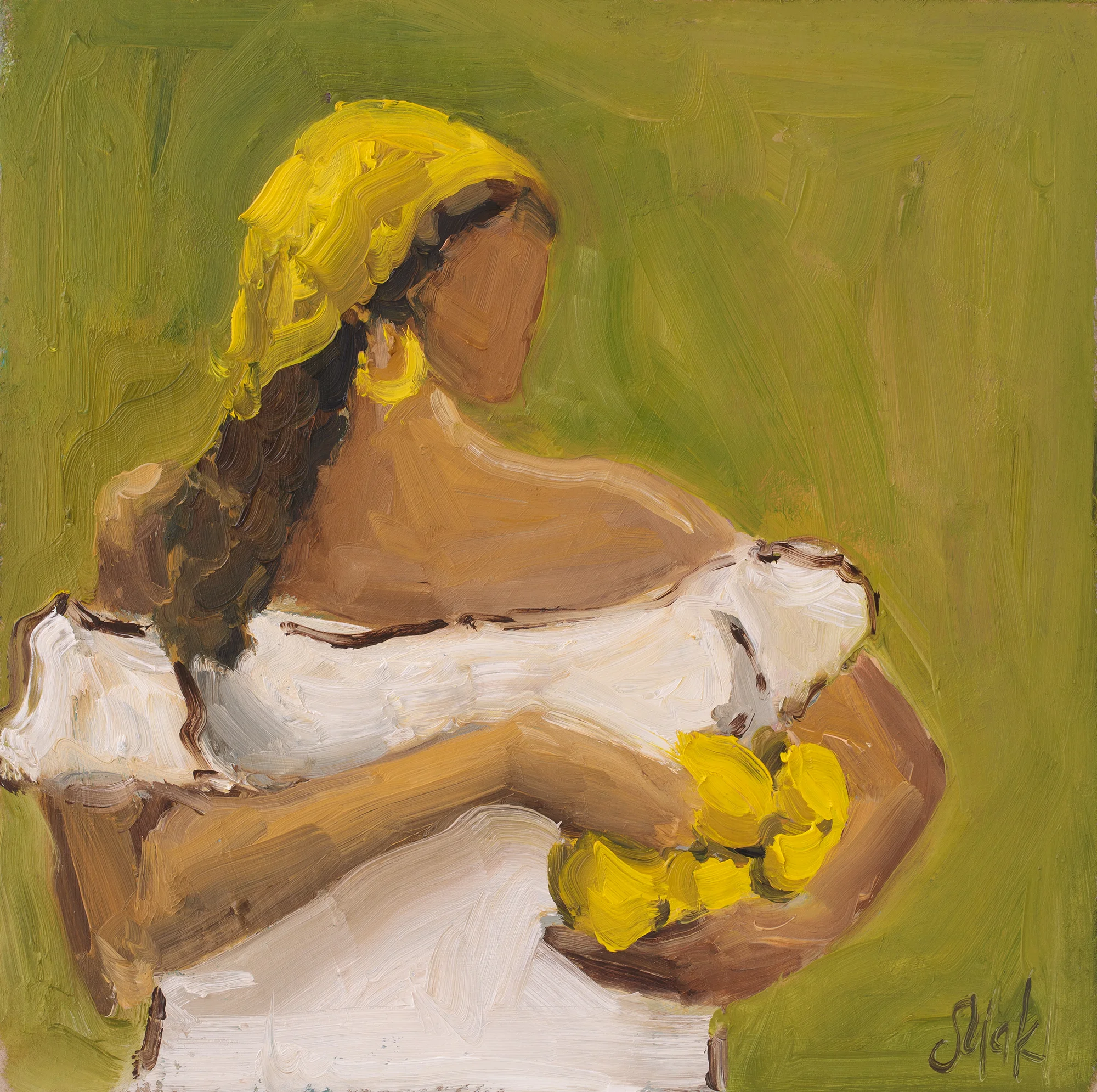Woman with Lemon Oil Painting: Boho Girl Portrait, Abstract Figurative Art
